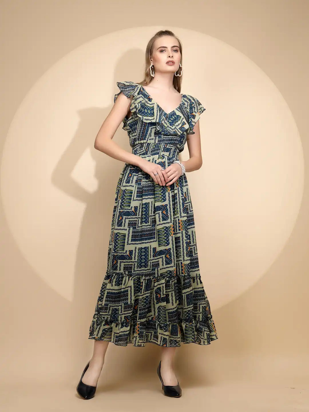 Blue And White Polyester Blend Regular Fit Dress For Women