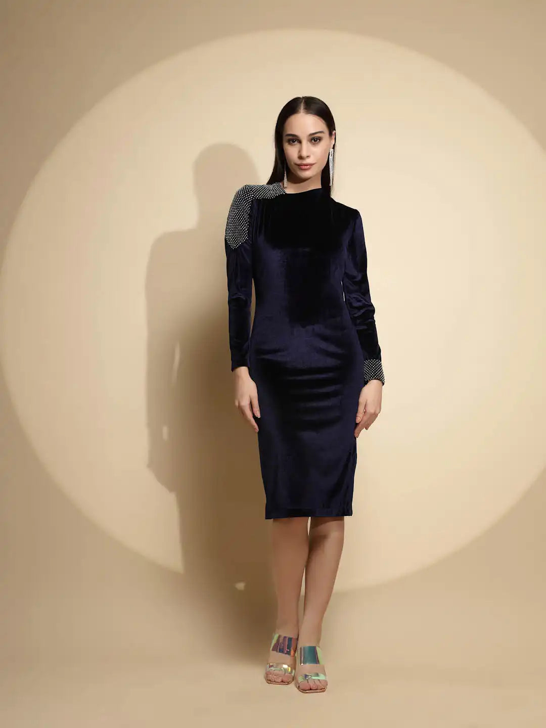 Dark Blue Embellished Full Sleeve Asymmetric Neck Velvet Bodycon Winter Dress