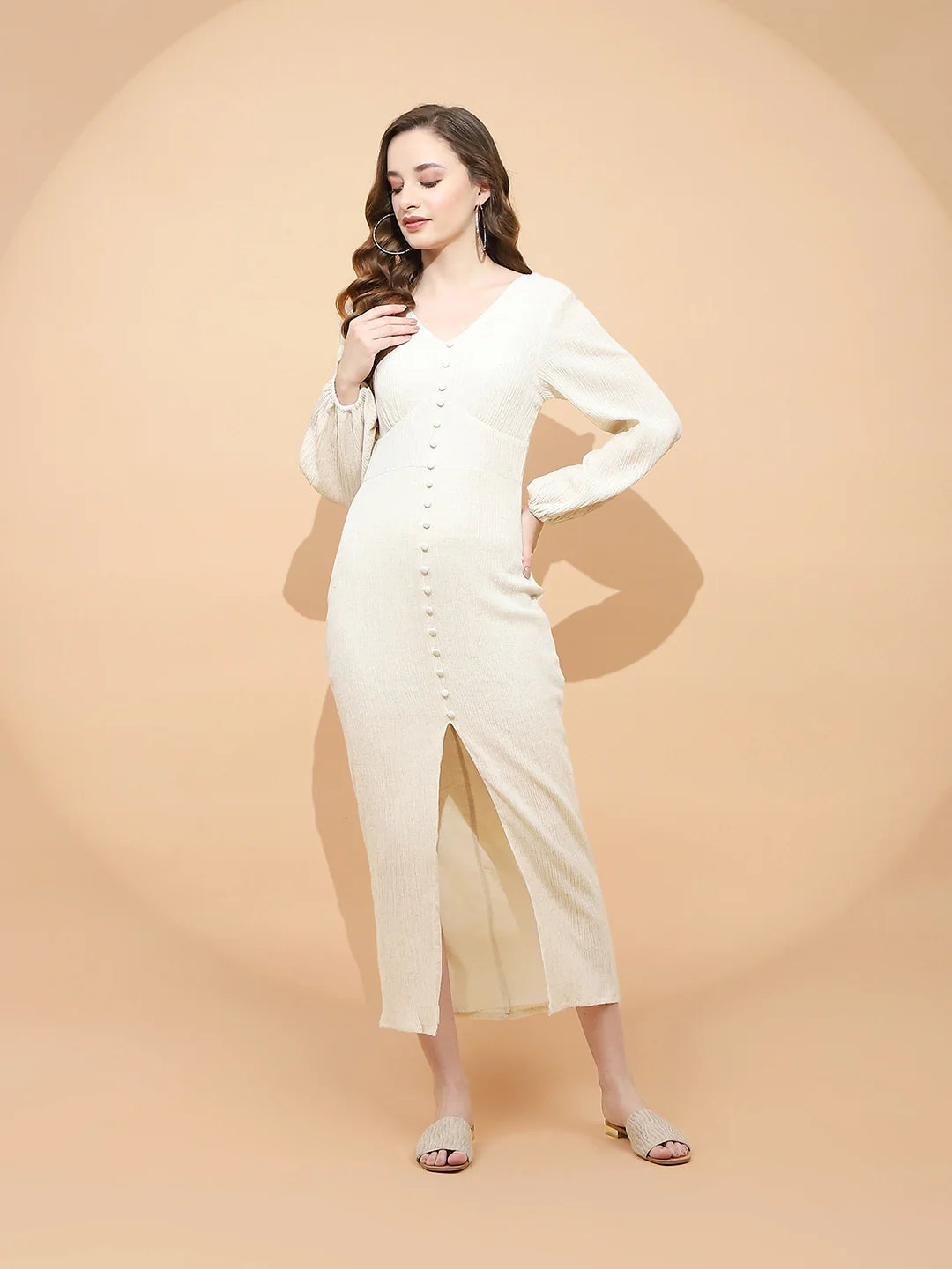/ Natural Beige Linen Slim Fit Dress For Women
