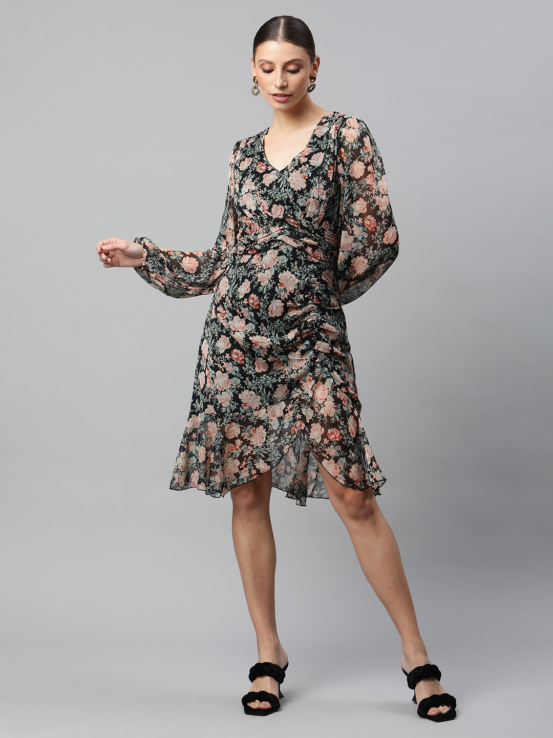 Women Black Floral Printed Asymmetric Hem Dress